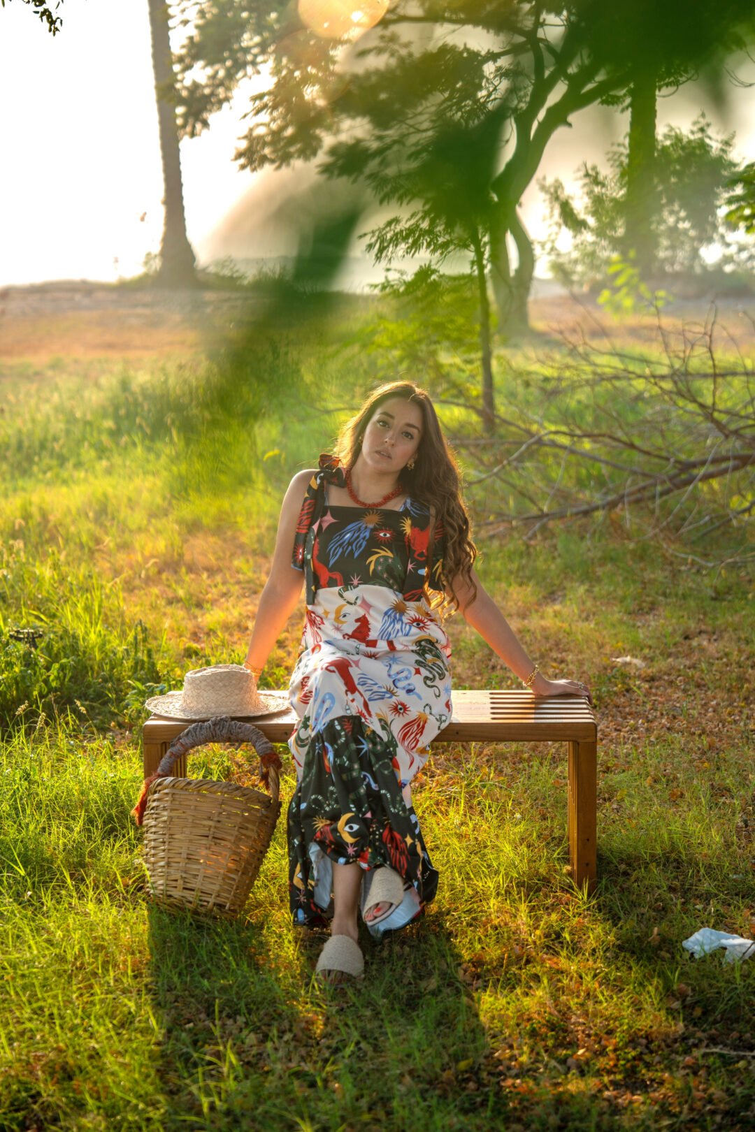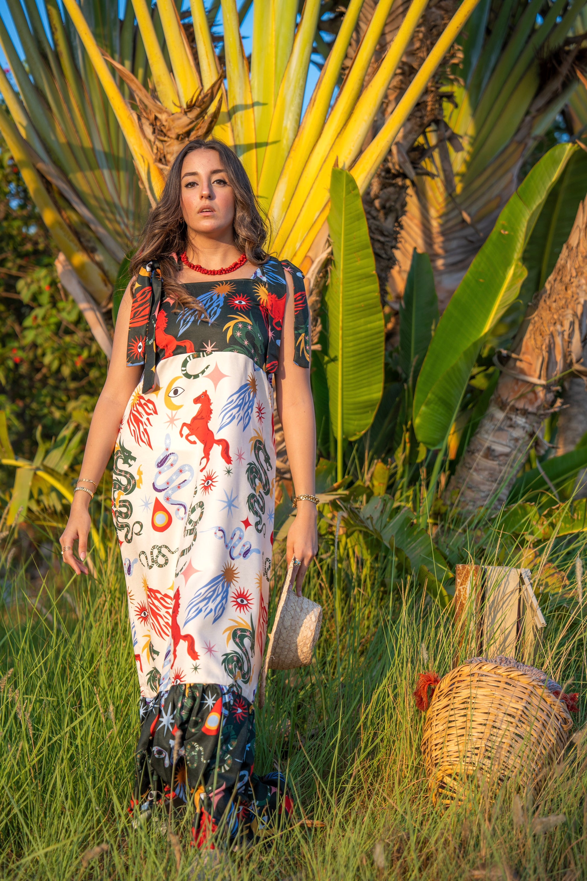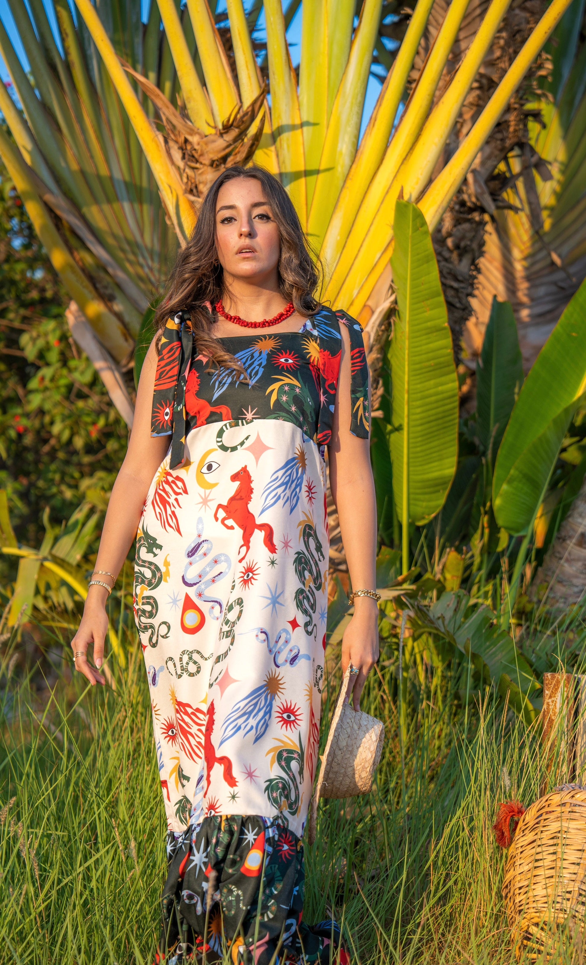 The Dragon Eclipse dress features a captivating pattern of dragons and mystery on an non transparent linen material