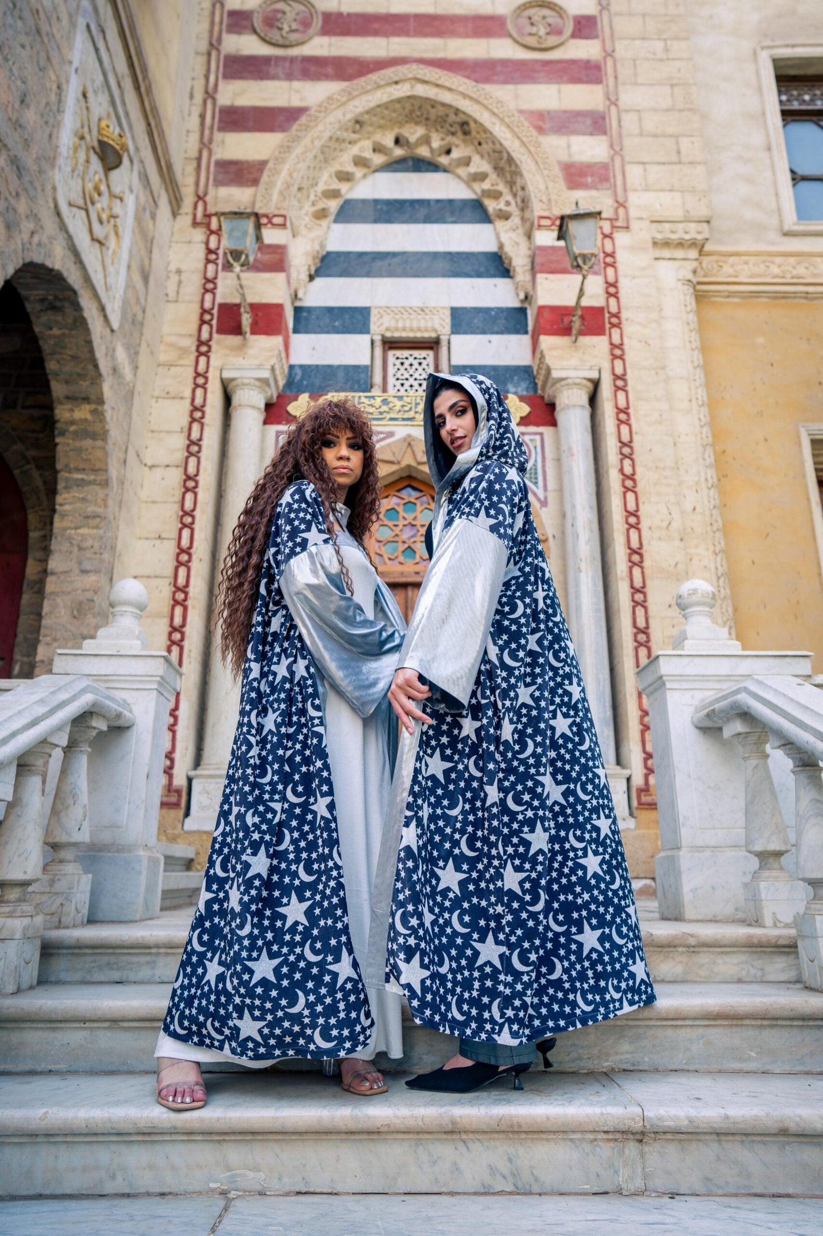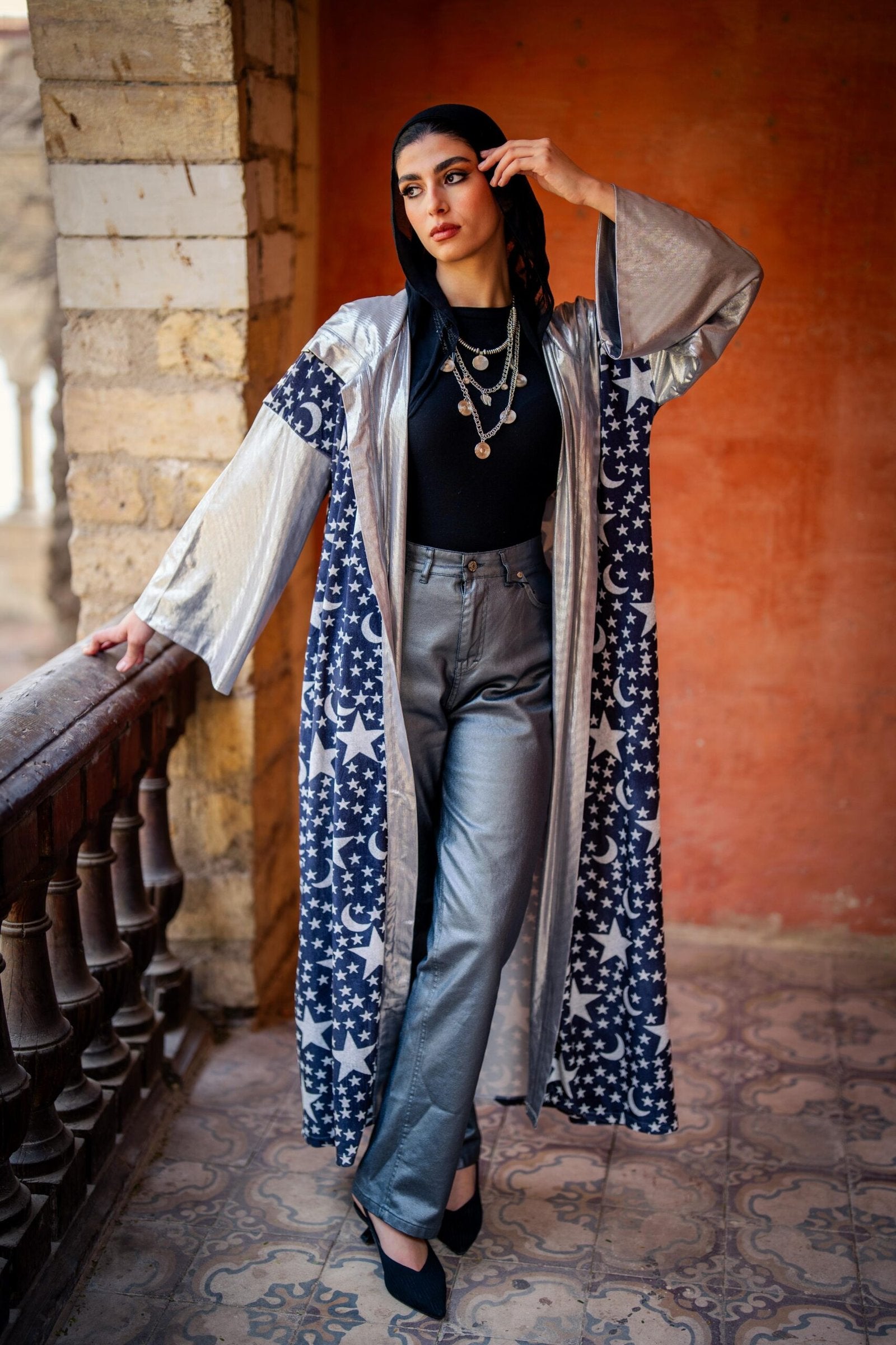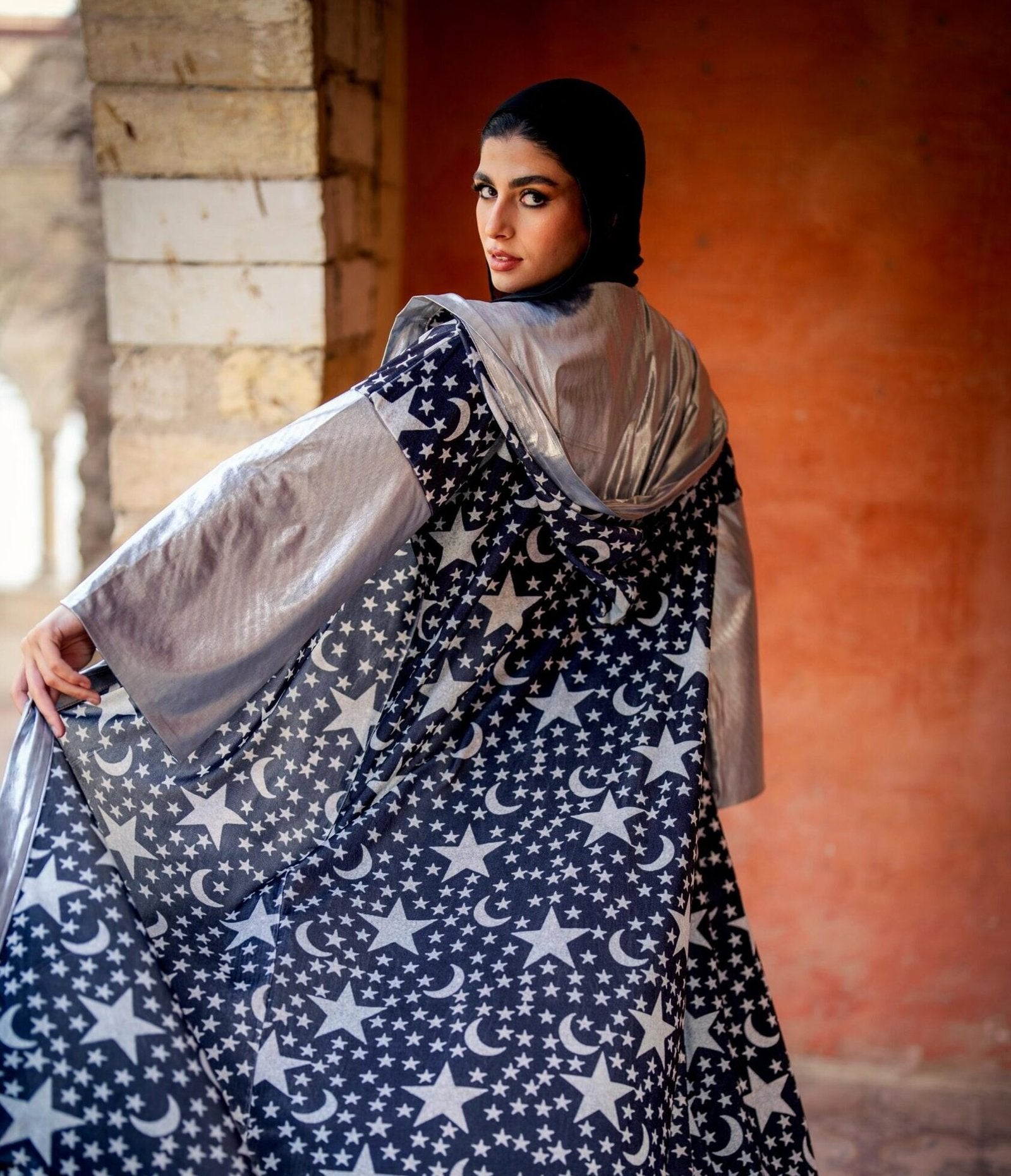 Nojoum Ramadan kaftan made from rich velvet with shimmering disco fabric details, reflecting the beauty of Ramadan nights. your perfect choice for gathering sand cherished moments under the starlit sky.
