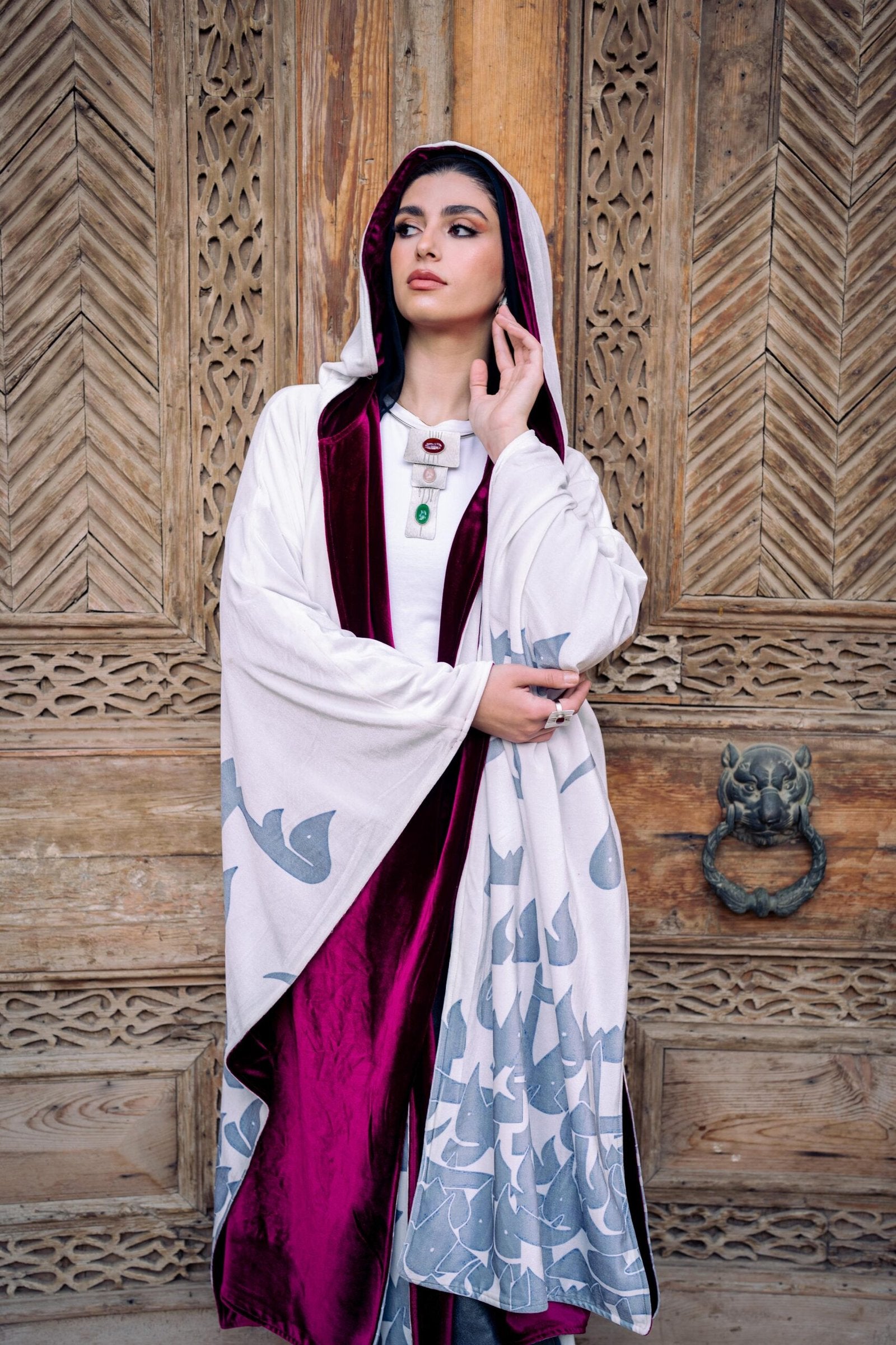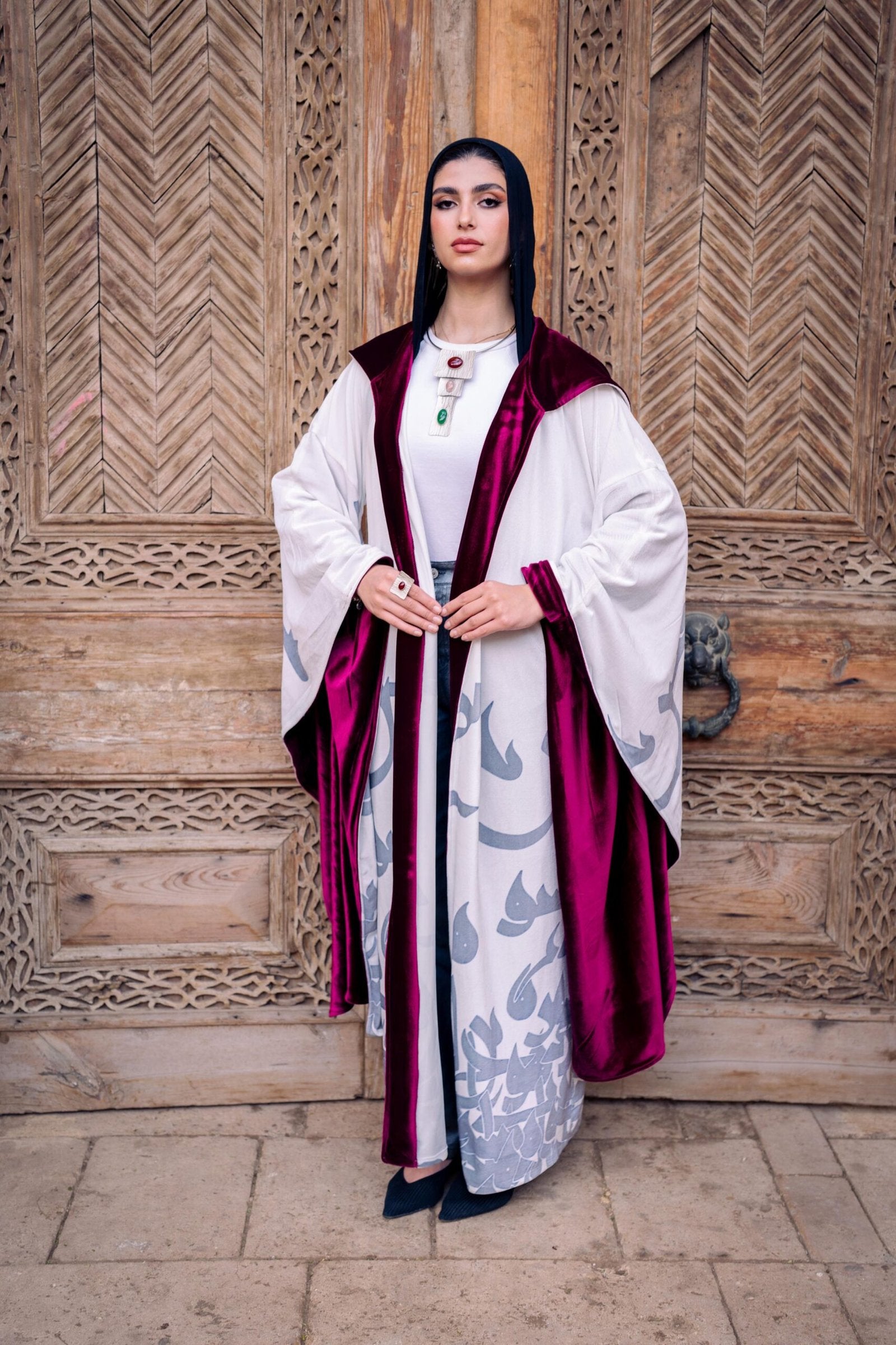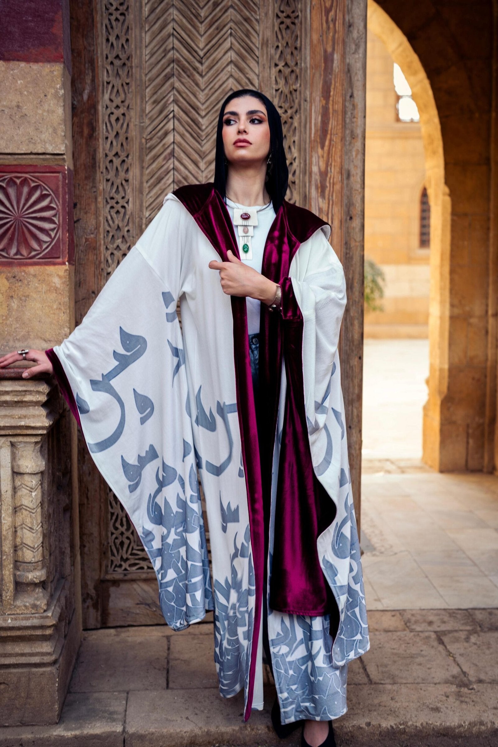 Yaqout...ياقوت crafted from luxurious velvet, this kaftan is designed for cold Ramadan nights, offering both warmth and elegance. The grey Arabic calligraphy adds a cultural touch, while the rich burgundy lining is the perfect match, adding an extra layer of warmth